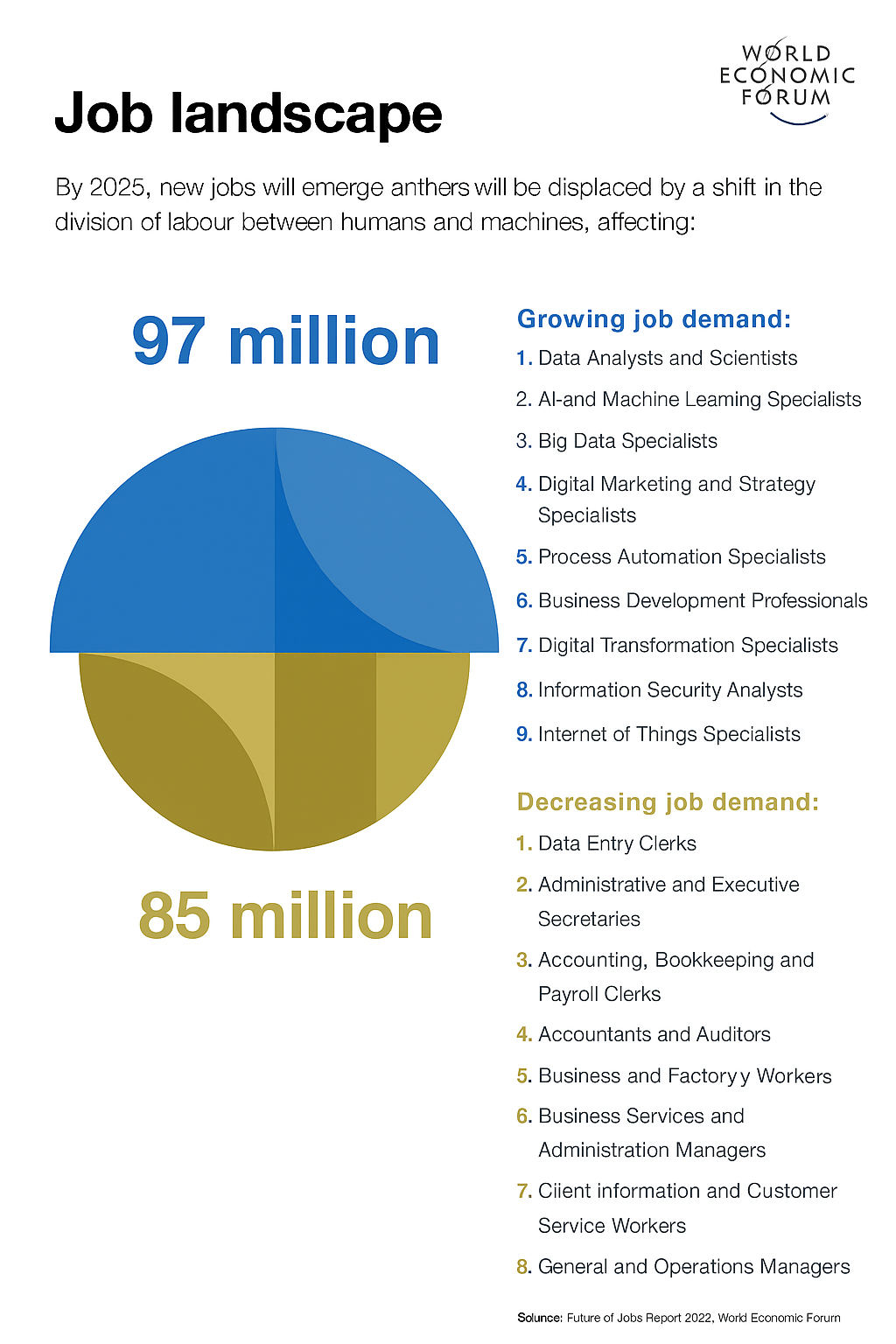 In the end of 2025, 85 million jobs are projected to be lost and 97 million are projected to be created, The tasks where humans are set to retain their comparative advantage include managing, advising, decision-making, reasoning, communicating and interacting